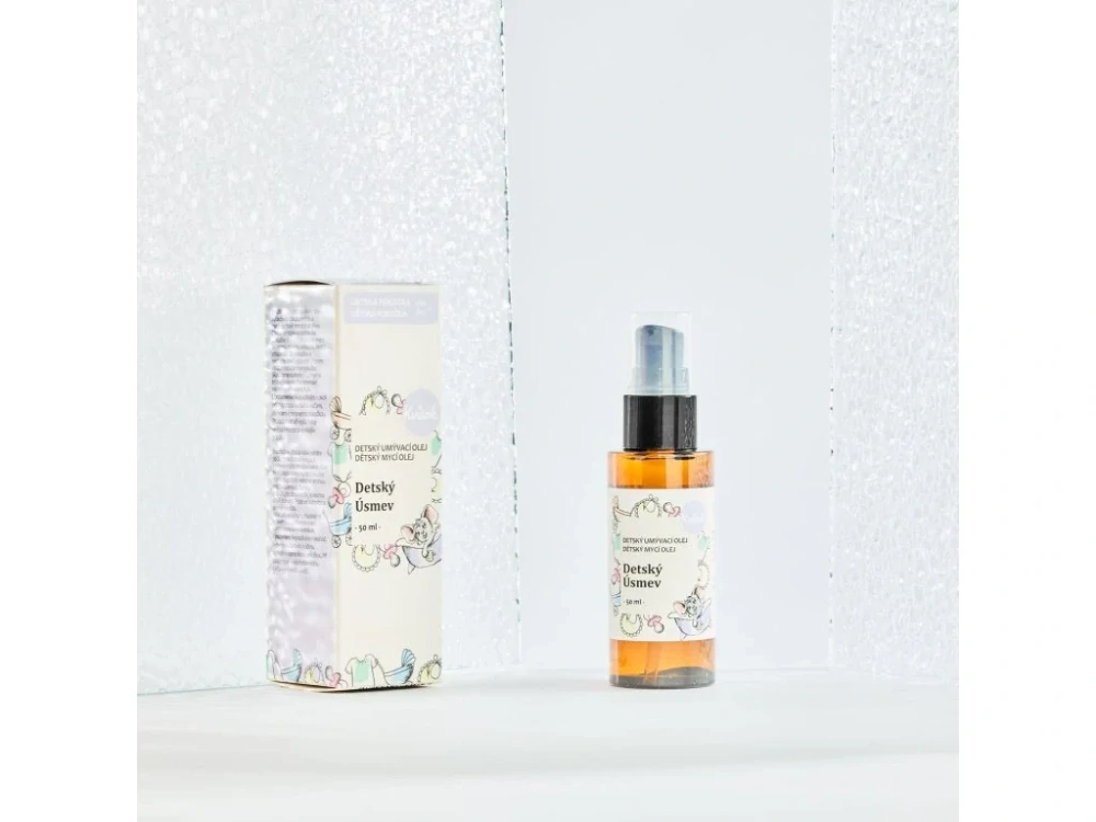 Čistiaci olej Detský úsmev je veľmi jemný a k pokožke bábätka šetrný najmä vďaka obsahu jemného Mandľového oleja, ktorý je vhodný pre všetky typy pleti, svojím zložením je najbližší filmu ľudskej pokožky a iba málo ľudí má na tento olej alergiu, preto je vhodný aj pre jemnú detskú pokožku. Má ukľudňujúce účinky, spomaľuje starnutie pokožky, upokojuje zápaly, popáleniny,zosvetľuje tmavé škvrny na koži, zmierňuje svrbenie a je vynikajúci obzvlášť pre citlivú a suchú pleť.