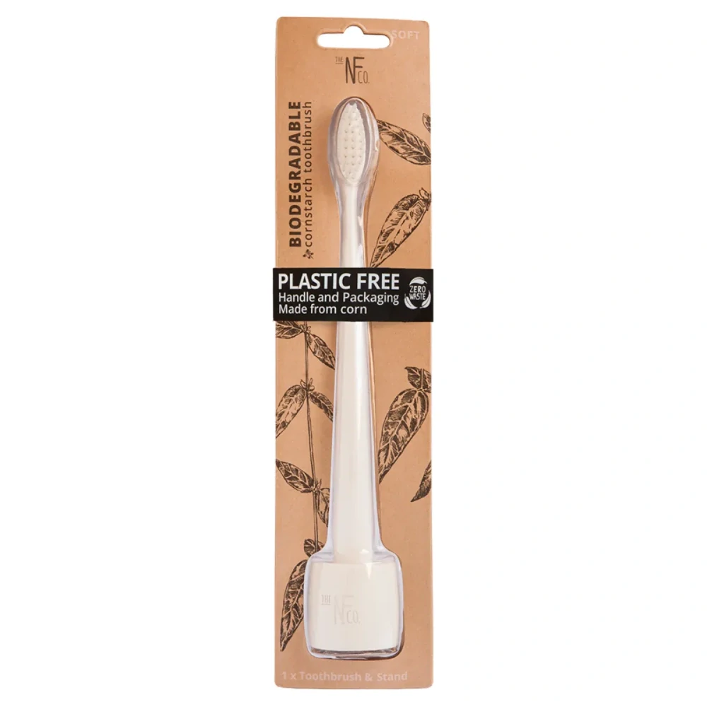 Biologicky rozložiteľná zubná kefka so stojančekom vyrobená zo 100 % NON-GMO kukuričného škrobu si vás ihneď získa.