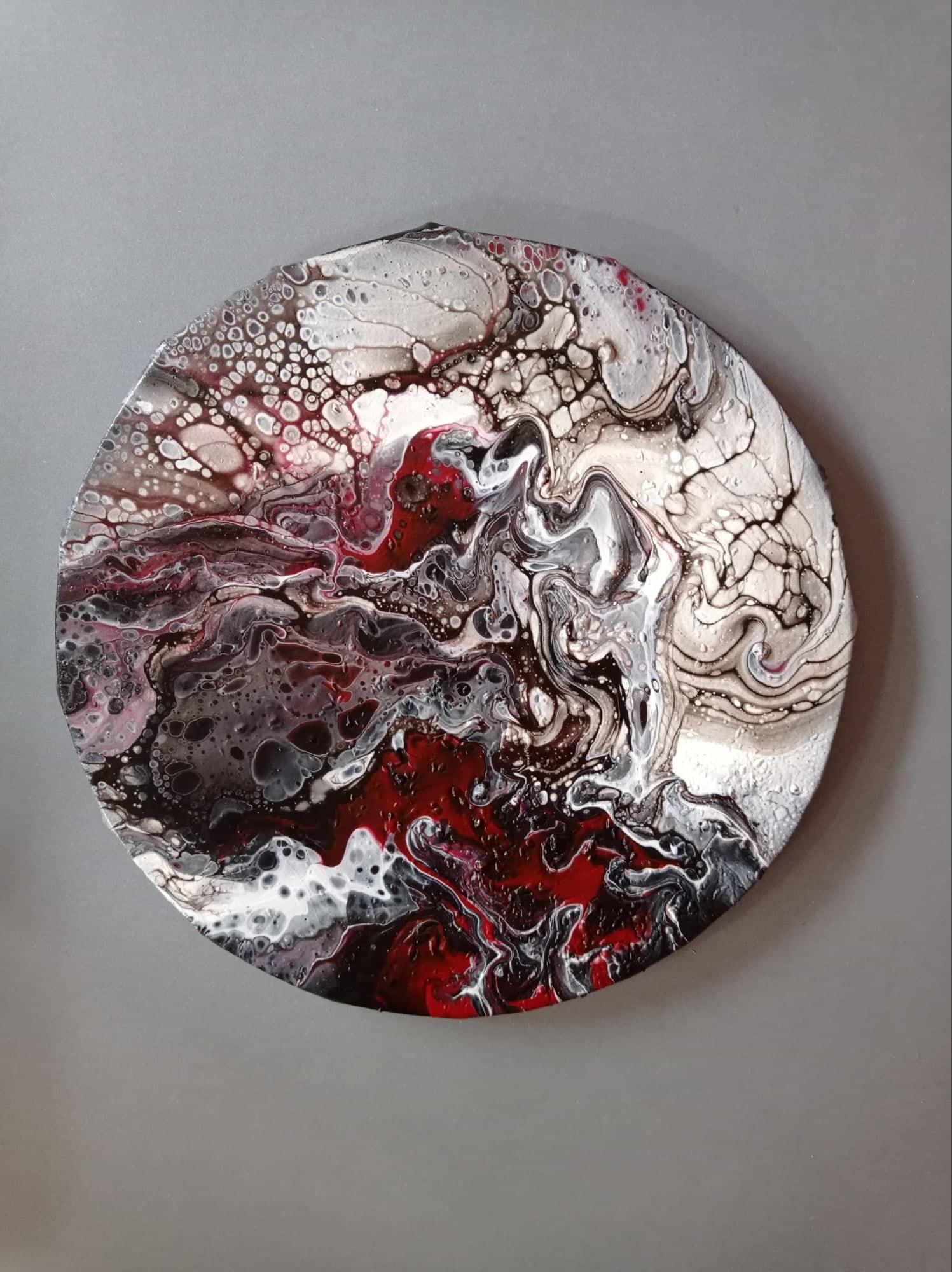 Abstraktný obraz robený pouring technikou, akryl na plátne v priemere 30 cm je krásnou interiérovou dekoráciou.