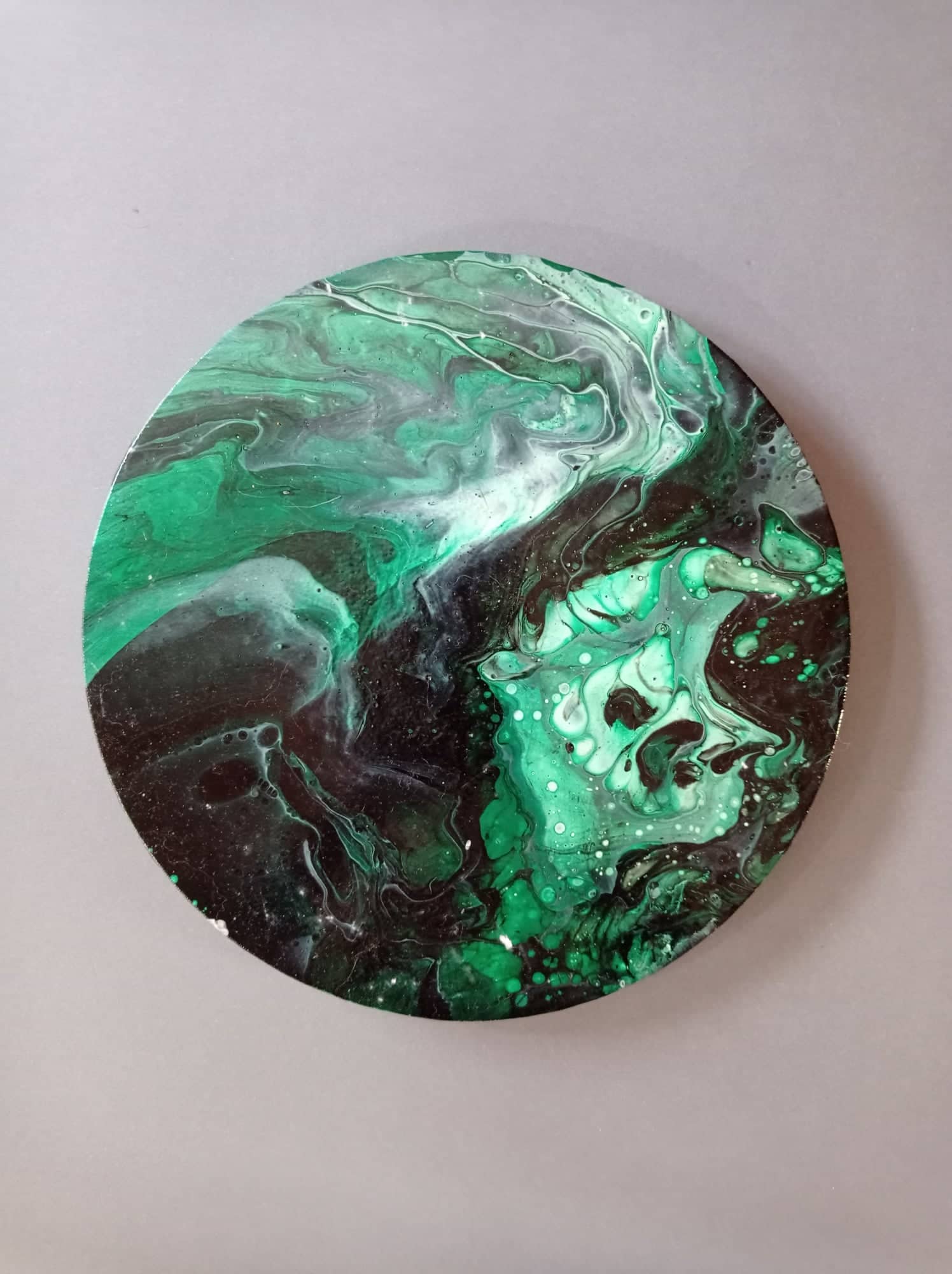 Abstraktný obraz robený pouring technikou, akryl na plátne v priemere 30 cm je krásnou interiérovou dekoráciou.