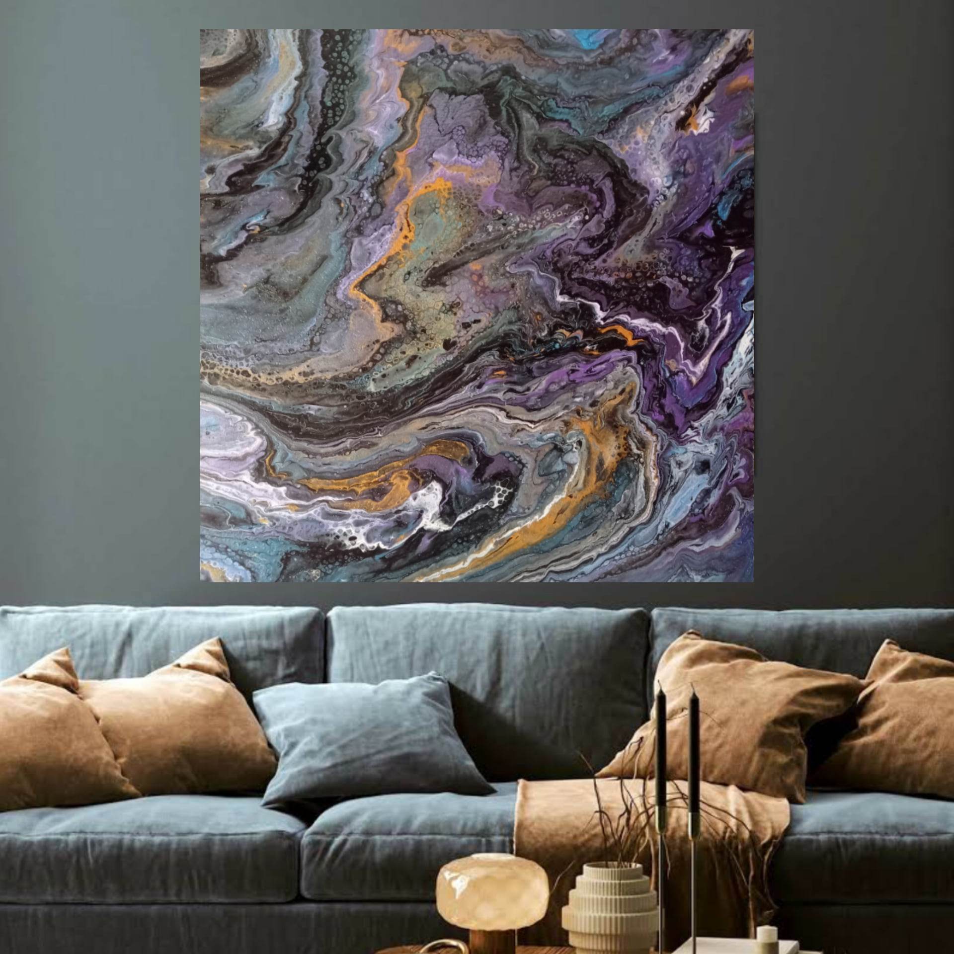 Abstraktný obraz robený pouring technikou, akryl na plátne v rozmere 100 x 100 cm je krásnou interiérovou dekoráciou.