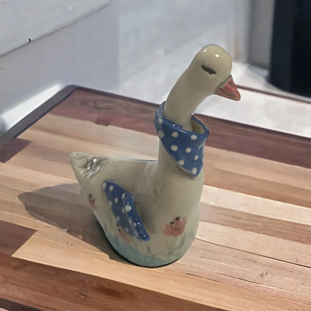 Ručne vyrobená a maľovaná keramická husička s jemnými kvetinovými detailmi a bodkovanou šatkou pôsobí nežne a nostalgicky.