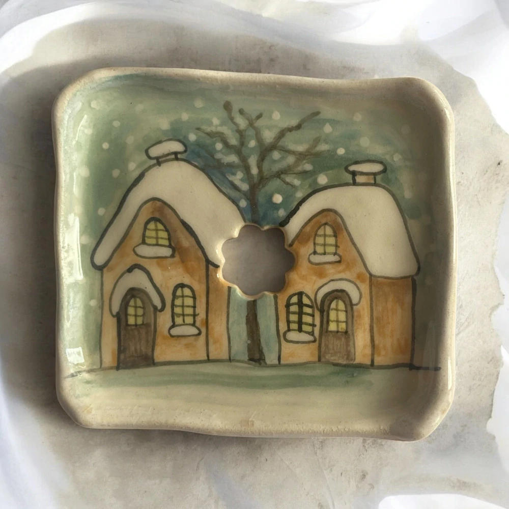 Keramická hand made mydelnička plná radosti - Zimné domčeky 🏡❄️✨: