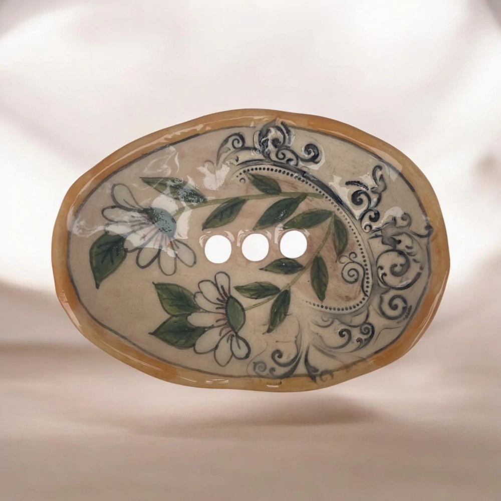 Ručne maľovaná keramická mydelnička s lúčnym kvetom a jemným ornamentom prinesie do kúpeľne pokoj vidieka. Teplé prírodné tóny a drobný plastický kvietok vytvárajú romantický, domácky detail. 🌿🤍