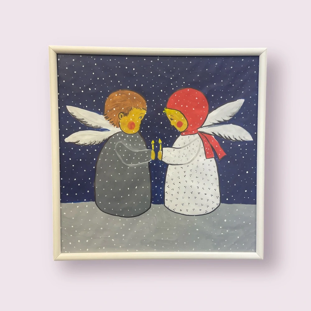 Tento rozkošný hand-made obrázok zachytáva dvoch anjelikov, ktorí v tichej zimnej noci držia medzi dlaňami malé svetielka – symbol nádeje, dobra a nehy.