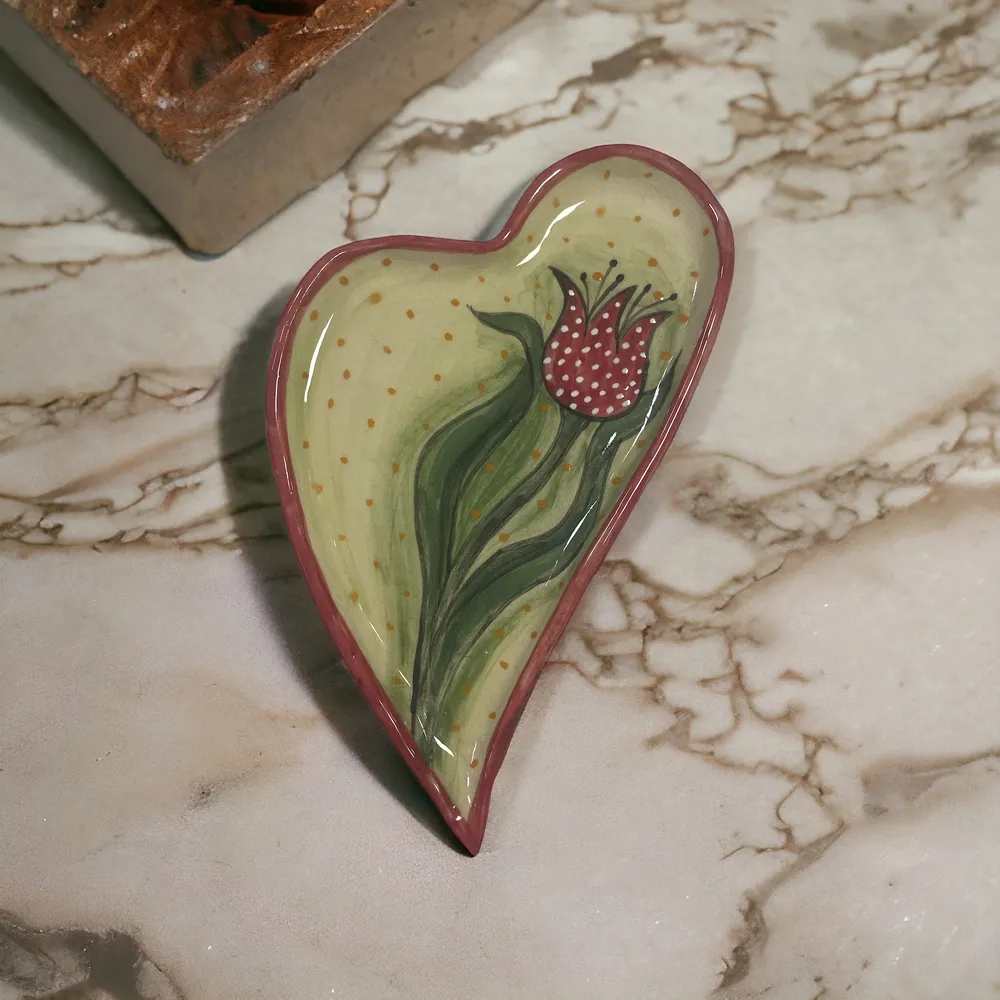Ručne tvorená keramická tácka v tvare srdca s maľovaným tulipánom. Prináša do domova farby, jemnosť a hrejivý dotyk ručnej práce. 🌿🌷