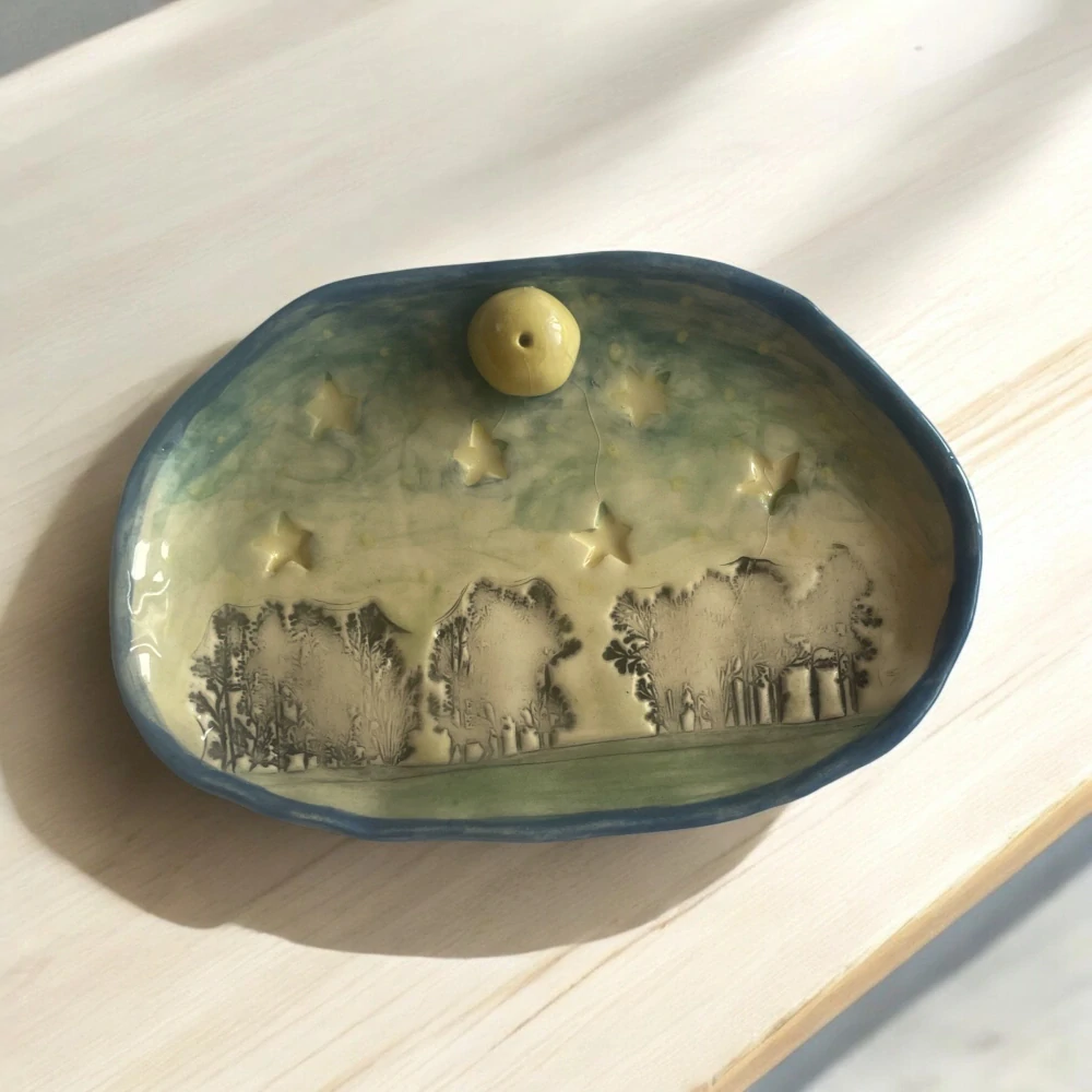Ručne robený keramický stojan na vonné tyčinky zachytáva tichú krásu nočnej oblohy nad lesom. Jemne modelované stromy a plastické hviezdy vytvárajú upokojujúcu scenériu, v ktorej sa mieša ticho prírody s kúzlom večera. Nad krajinou sa vznáša žltý mesiac – keramický držiak na vonnú tyčinku – z ktorého sa vôňa šíri ako svetlo z hviezdy.