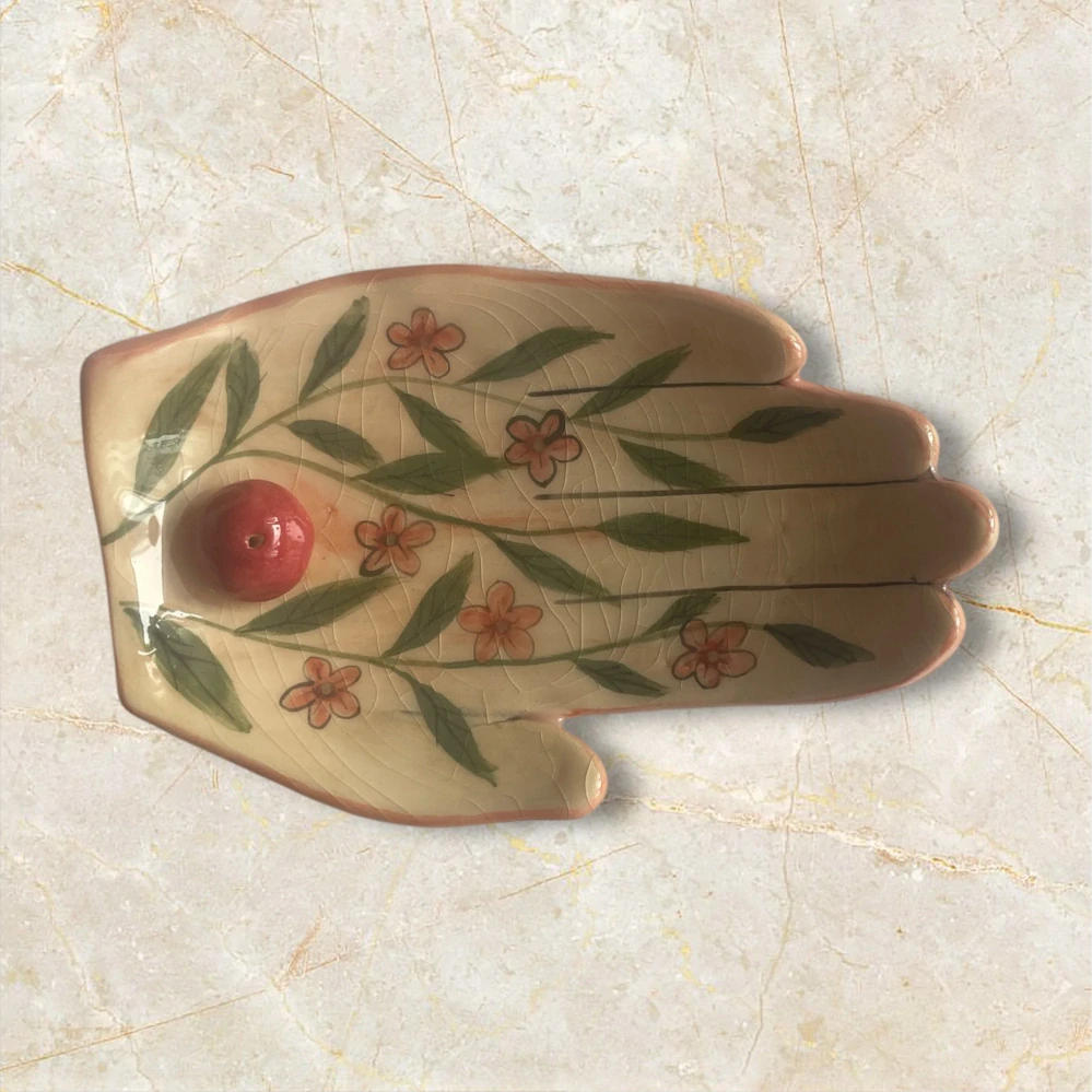 Ručne vytvorený keramický stojan v tvare dlane je poctou jemnosti, starostlivosti a pokoju. Jeho povrch zdobia drobné ružové kvietky a zelené lístky, ktoré akoby rástli priamo z prstov – ako symbol života, rastu a vnútornej harmónie. V mieste dlane sa nachádza červený keramický držiak na vonnú tyčinku, z ktorého sa šíri vôňa ako tiché požehnanie.