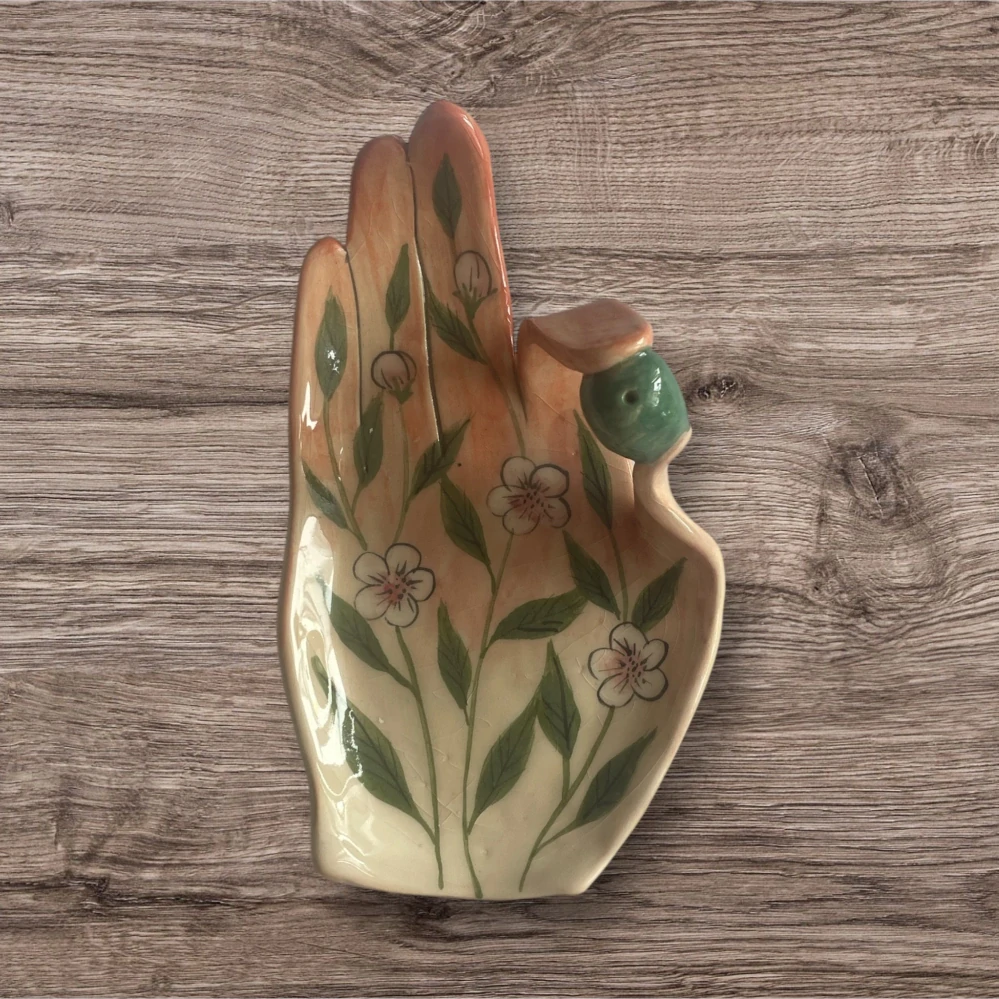 Ručne vytvorený keramický stojan v tvare vzpriamenej ruky v sebe nesie silu ochrany, požehnania a rovnováhy. Maľovaný jemnými kvetmi a lístkami, pôsobí ako symbol mieru, čistoty a prirodzenosti. Na palci sa nachádza zelený keramický držiak – detail v tvare hlavičky, ktorý ukrýva otvor na vonnú tyčinku.
