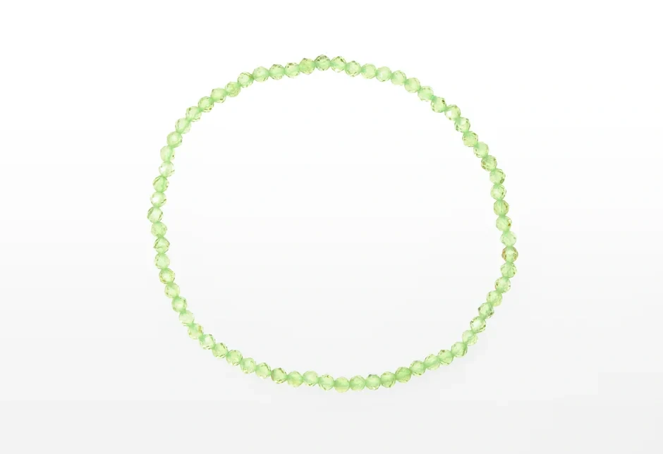 Žiarivo zelený fazetovaný náramok z 3 mm Olivínu, pomáha svojmu nostiteľovi vniesť do života peniaze, lásku a šťastie, je silným ochranným amuletom.