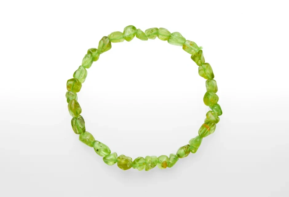 Žiarivo zelený náramok z tromlovaných kúskov kvalitného Olivínu, pomáha svojmu nostiteľovi vniesť do života peniaze, lásku a šťastie, je silným ochranným amuletom.