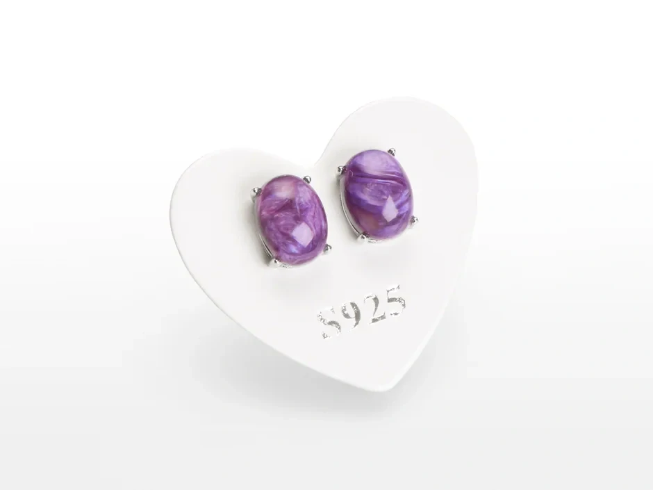 V týchto očarujúcich náušniciach sa spája elegancia striebra s magickou hĺbkou fialového Čaroitu. Každý kameň svojimi prelivmi od levanduľovej po tmavofialovú pripomína závoj tajomstva a duchovnej premeny. Jemný oválny výbrus 5×7 mm odhaľuje jeho vnútorný lesk, ktorý pri každom pohybe ožíva ako tichý záblesk svetla duše.
